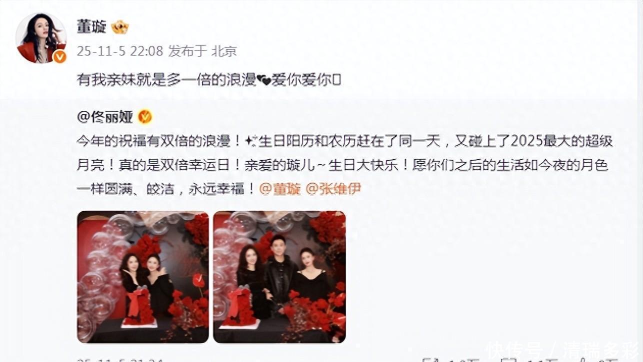 董璇46岁生日,挽着老公张维伊甜蜜同框,夫妻无惧争议越来越爱 11 月 5 号这天,佟丽娅在自己社交账号上发了好多给董璇庆生的照片,还特意写了祝福的话,俩人这闺蜜情也太让人羡慕了吧!丫丫不光祝董璇 46 岁生日快乐,还特意提到了她老公张维伊,希望夫妻俩能一直幸福,真的好暖心呀~ 董璇很快就转发了这条动态,还说 “有我亲妹妹在,浪漫都多了一倍,爱你爱你”,这感情真的没话说! 照片里的俩人也太会美了吧!董璇作为寿星,状态好到爆~ 染了卷发披着,涂着超显气色的红唇,穿一身黑色衣服,把好身材衬得妥妥的。就算是蹲着拍照,皮肤白皙五官精致的样子也藏不住,谁能想到都 46 岁了还这么年轻漂亮,也太养眼了!旁边的佟丽娅也丝毫不输,都四十多岁了还是那么美,露肩黑裙一穿,又性感又大气,俩人手挨着手站在一起,真的分不出来谁更惊艳,都超吸睛的~