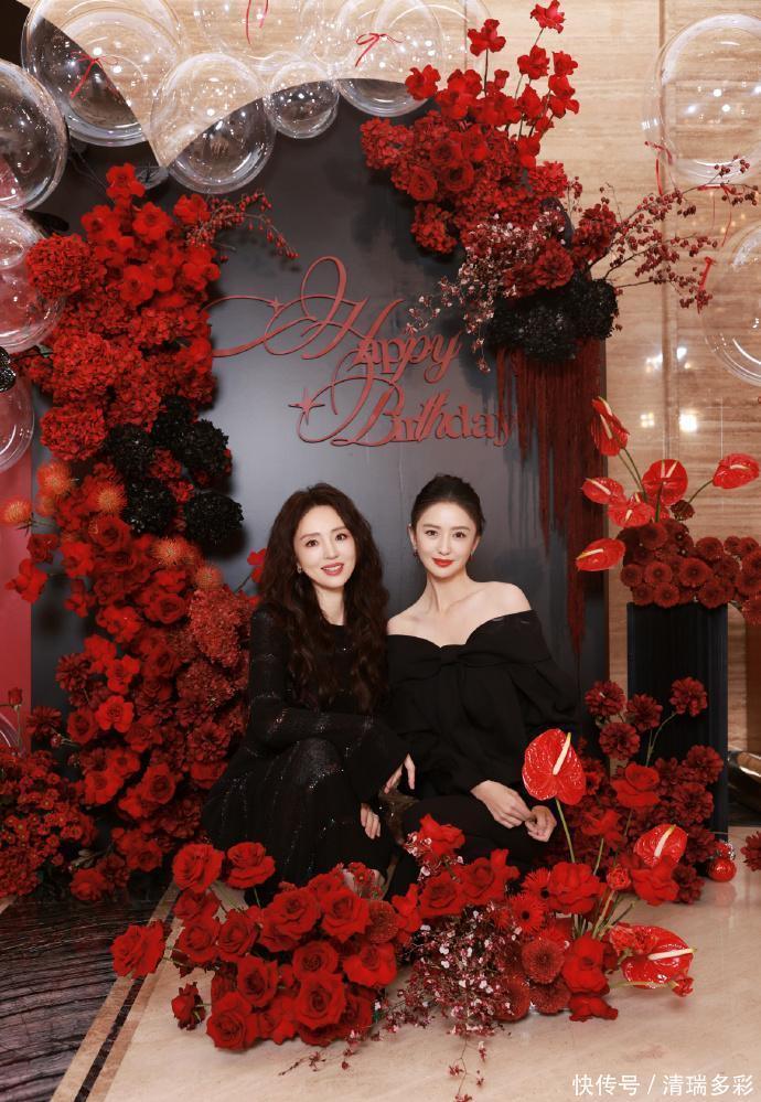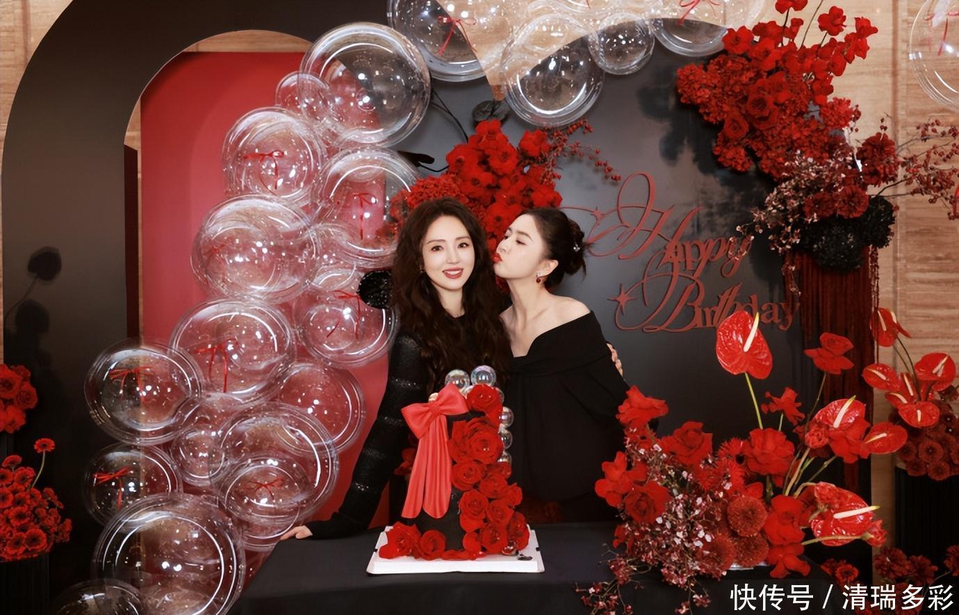 董璇对着镜头笑得超甜,佟丽娅还调皮地嘟着嘴要亲她,一个优雅端庄一个俏皮可爱,画面也太美好了!难怪大家总说她俩是异父异母的双胞胎,都过了四十岁还是那么像,颜值都这么能打,真的让人羡慕到不行。俩人对着镜头比心的样子,董璇看着完全不像四十多岁的人,说三十出头都有人信,佟丽娅的巴掌脸更是绝了,俩闺蜜直接美出新高! 这次生日派对布置得好有氛围感,到处都是红色的花,就连生日蛋糕上都镶着大红色玫瑰,一看就是花了心思准备的,大概率是张维伊精心安排的吧~ 董璇和佟丽娅还对着镜头做捧脸杀,笑得超开心,隔着屏幕都能感受到她们的快乐!董璇的女儿小酒窝也出镜了,穿着黑色小裙子,红黑搭配也太好看了吧~ 小姑娘完美遗传了爸妈的高颜值,长得特别灵气,跟妈妈、丫丫同框,颜值一点都不落下风,以后肯定也是个大美女!